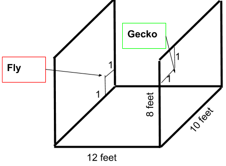 The Gecko is 6 feet above the fly (vertical), 8 feet horizontally forward from it, and 12 feet horizontally left from it.