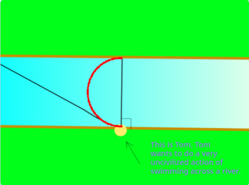 So the angle he swims at shall be tangent to that semi-circular path? I think my intuition serves me incorrectly.