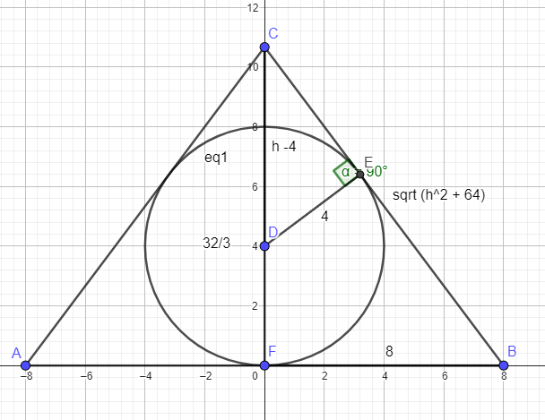 This forms a right triangle similar to the first one with a leg DE = 4 and a hypotenuse= DC = h - 4