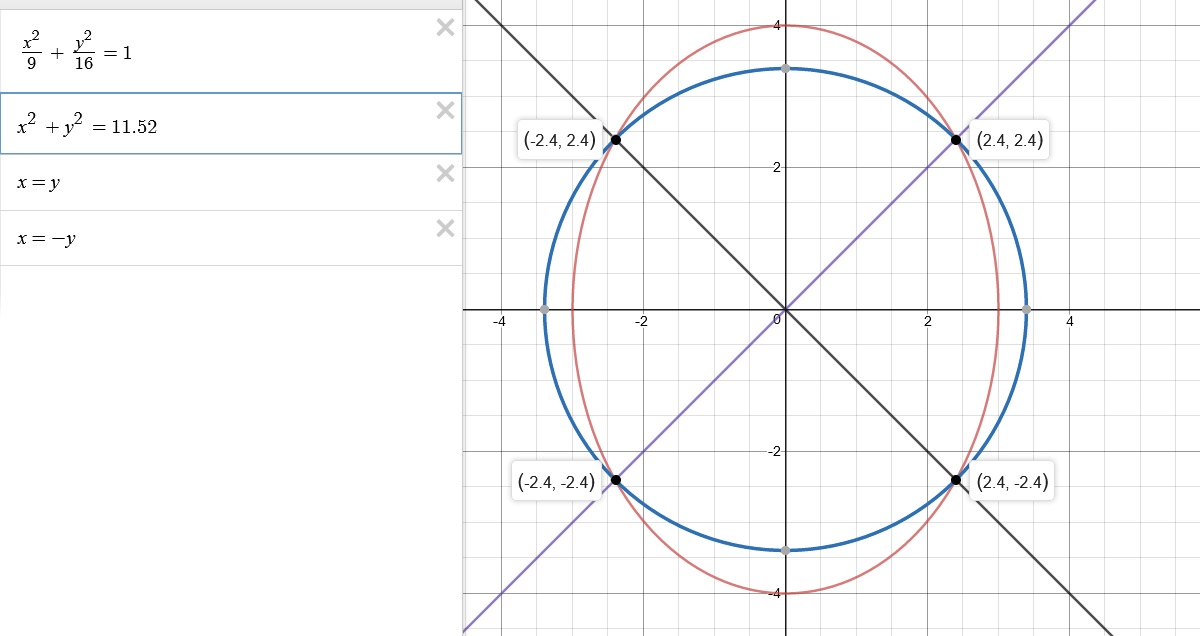 now for a square to be on this circle (centered on the origin, along with the ellipse), the x's and the y's absolute value in all of the quadrants must be equal (think about it)