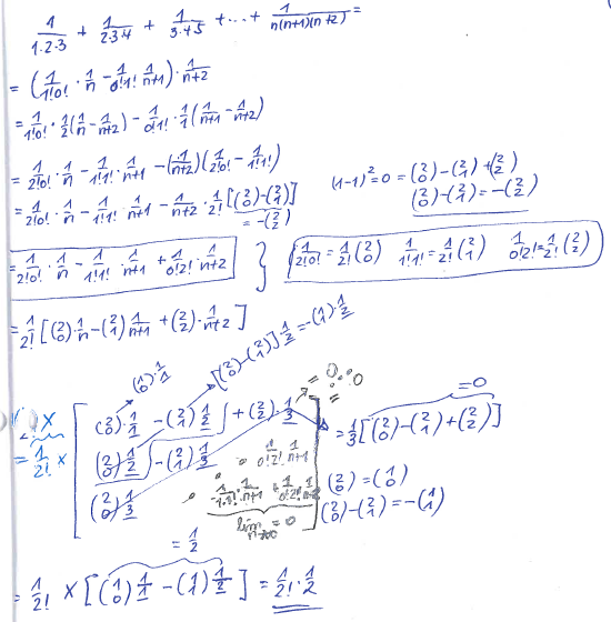 \(\begin{array}{lcll} s = \dfrac{1}{1 \cdot 2 } + \dfrac{1}{2 \cdot 3} + \dfrac{1}{3 \cdot 4 } + \dfrac{1}{4 \cdot 5 } + \cdots \ + \dfrac{1}{n \cdot (n+1)} + \cdots =\ \frac{1}{1!0!}\cdot \frac{1}{1} = 1 \\\\ s =\mathbf{ \dfrac{1}{1 \cdot 2 \cdot 3} + \dfrac{1}{2 \cdot 3 \cdot 4} + \dfrac{1}{3 \cdot 4 \cdot 5} + \dfrac{1}{4 \cdot 5 \cdot 6} + \cdots \ + \dfrac{1}{n \cdot (n+1) \cdot (n+2)} + \cdots =\ \frac{1}{2!0!}\cdot \frac{1}{2} } = \frac{1}{4} \\\\ s = \dfrac{1}{1 \cdot 2 \cdot 3 \cdot 4} + \dfrac{1}{2 \cdot 3 \cdot 4 \cdot 5} + \dfrac{1}{3 \cdot 4 \cdot 5 \cdot 6} + \dfrac{1}{4 \cdot 5 \cdot 6 \cdot 7} + \cdots \ + \dfrac{1}{n \cdot (n+1) \cdot (n+2) \cdot (n+3)} + \cdots =\ \frac{1}{3!0!}\cdot \frac{1}{3} = \frac{1}{18} \\\\ s = \dfrac{1}{1 \cdot 2 \cdot 3 \cdot 4 \cdot 5} + \dfrac{1}{2 \cdot 3 \cdot 4 \cdot 5 \cdot 6} + \dfrac{1}{3 \cdot 4 \cdot 5 \cdot 6 \cdot 7} + \dfrac{1}{4 \cdot 5 \cdot 6 \cdot 7 \cdot 8} + \cdots \ + \dfrac{1}{n \cdot (n+1) \cdot (n+2) \cdot (n+3 \cdot (n+4) } + \cdots =\ \frac{1}{4!0!}\cdot \frac{1}{4} = \frac{1}{96} \\\\ \ldots \\ s = \dfrac{1}{1 \cdot 2 \cdot 3 \cdots } + \dfrac{1}{2 \cdot 3 \cdot 4 \cdots } + \dfrac{1}{3 \cdot 4 \cdot 5 \cdots} + \cdots \ + \dfrac{1}{n \cdot (n+1) \cdot (n+2)\cdot~\cdots ~\cdot (n+m) } + \cdots =\ \frac{1}{m!0!}\cdot \frac{1}{m} = \frac{1}{m\cdot m!} = \frac{1}{(m+1)!-m!} \\\\ \end{array} \\ \)
