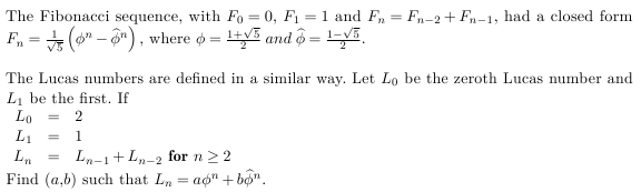 The Fibonacci sequence, with \(F_0 = 0\), \(F_1 = 1\) and \(F_n = F_{n - 2} + F_{n - 1}\), had a closed form \(F_n = \frac{1}{\sqrt{5}} \left( \phi^n - \widehat{\phi}^n \right),\) where \(\phi = \frac{1 + \sqrt{5}}{2} \; \text{and} \; \widehat{\phi} = \frac{1 - \sqrt{5}}{2}.\) The Lucas numbers are defined in a similar way. Let \(L_0\) be the zeroth Lucas number and \(L_1\) be the first. If \(\begin{align*} L_0 &= 2 \\ L_1 &= 1 \\ L_n &= L_{n - 1} + L_{n - 2} \; \text{for}\; n \geq 2 \end{align*}\) Find \((a,b)\) such that \(L_n = a\phi^n + b\widehat{\phi}^n.\)