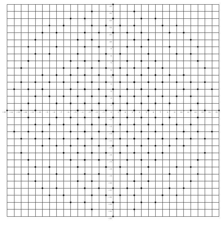 \foreach \v/\w in {5/0,4/3,3/4,0/5,-5/0,-4/3,-3/4,4/-3,3/-4,0/-5/,-4/-3/,-3/-4} %{\v \w,}