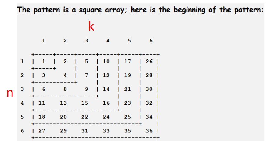 \(\begin{array}{|rcll|} \hline T(n,k) &=& (k-1)^2+2n-1 \qquad & n\le k \\ T(n,k)&=&(n-1)^2+2k \qquad & n>k \\ \hline \end{array}\)