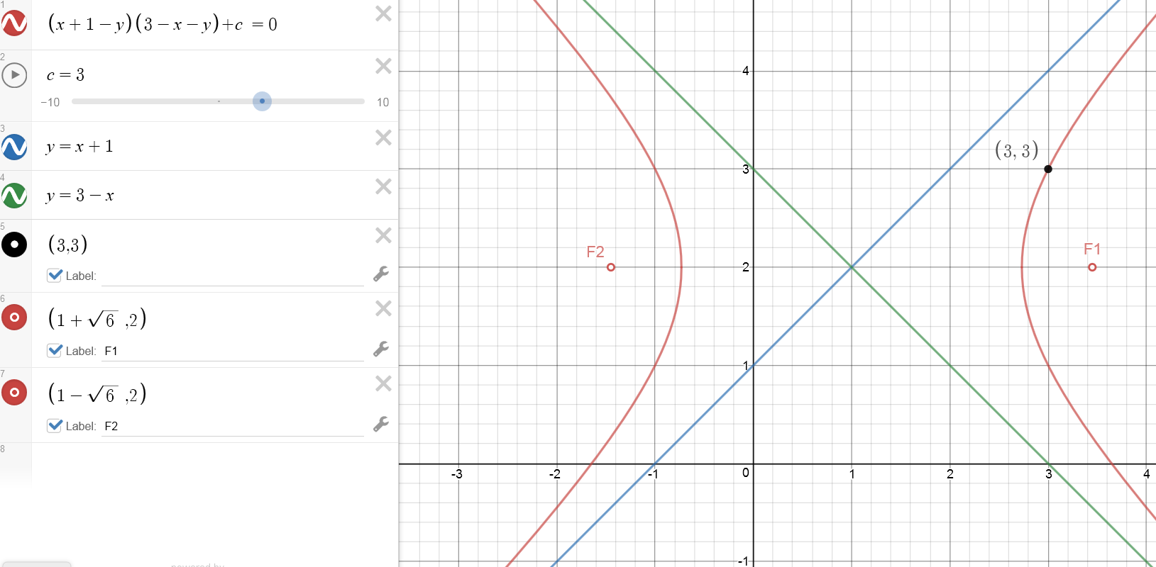The asymptotes of a hyperbola are y=x+1 and y=3-x. Also, the hyperbola passes through (3,3).