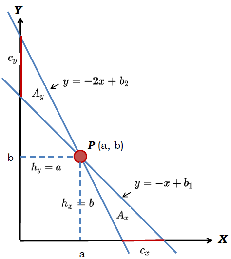 Lines with slopes -1 and -2 are drawn through the first quadrant point (a,b) forming one triangle