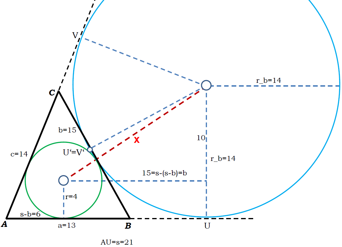 \(\begin{array}{|rcll|} \hline AU &=& AV \\ AU+AV &=& (a+BU)+(c+CV) \\ &=& a+c+BU+CV \quad | \quad BU = BU',\ CV=CV' \\ &=& a+c+BU'+CV' \quad | \quad BU'+CV' = b \\ &=& a+c+ b \\ AU+ AV&=& 2s \quad | \quad AV = AU \\ 2AU &=& 2s \\ \mathbf{ AU } &=& \mathbf{ s } \\ \hline \end{array} \)
