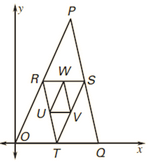 \(2)\\ \begin{array}{|rcl|rcl|rcl|} \hline && &P &=& S + \dfrac{QP}{2} & QP &=& 2(S-Q) \\ && &P &=& S + (S-Q) \\ && &P &=& 2S-Q & S&=&2V-\dfrac{Q}{2} \\ && &P &=& 4V-Q-Q \\ && &\mathbf{P} &=& \mathbf{4V-2Q} \\ \hline && &P &=& 2R & R&=&2U-\dfrac{Q}{2} \\ && &\mathbf{P} &=& \mathbf{4U-Q} \\ P= 4U-Q &=& 4V-2Q \\ 4U-Q &=& 4V-2Q \\ \mathbf{ Q }&=& \mathbf{4V-4U} \\ \hline \end{array} \\ 3)\\ \begin{array}{|rcl|rcl|rcl|} \hline W&=& \dfrac{1}{2}( R+S )& R&=&2U-\dfrac{Q}{2} & S&=&2V-\dfrac{Q}{2} \\ W&=& \dfrac{1}{2}( 2U-\dfrac{Q}{2}+2V-\dfrac{Q}{2} ) \\ W&=& \dfrac{1}{2}( 2U+2V-Q ) \\ \mathbf{ W }&=& \mathbf{U+V-\dfrac{Q}{2}} \\ \hline \end{array}\)