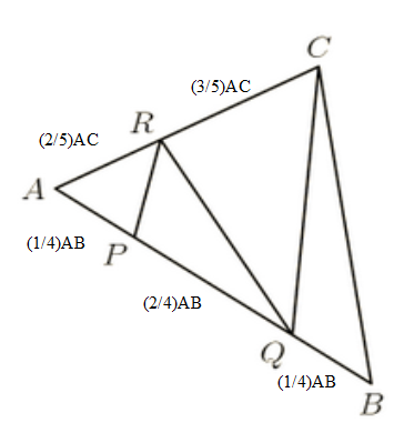 \(\text{Let $RA=\dfrac{2}{5}AC $} \\ \text{Let $CR=\dfrac{3}{5}AC $} \\ \text{Let $AP=\dfrac{1}{4}AB $} \\ \text{Let $AQ=\dfrac{3}{4}AB $} \)