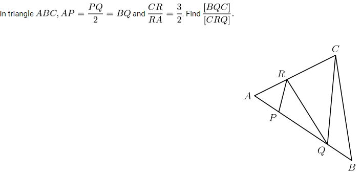 \(\begin{array}{|rcll|} \hline 2[ARQ] &=& \dfrac{2}{5}AC*\dfrac{3}{4}AB*\sin(A) \\ 2[ARQ] &=& \dfrac{3}{10}AB*AC*\sin(A) \\ 2[ARQ] &=& \dfrac{3}{10}*2[ABC] \\ \mathbf{2[ARQ]} &=& \mathbf{\dfrac{3}{5}[ABC]} \\ \hline \end{array} \begin{array}{|rcll|} \hline [CRQ] &=& [ACQ]-[ARQ] \quad | \quad * 2 \\ 2[CRQ] &=& 2[ACQ]-2[ARQ] \\ 2[CRQ] &=& 2[ACQ]-2[ARQ] \\ 2[CRQ] &=& \dfrac{3}{2}[ABC]- \dfrac{3}{5}[ABC] \quad | \quad : 2 \\ [CRQ] &=& \dfrac{3}{4}[ABC]- \dfrac{3}{10}[ABC] \\ [CRQ] &=& \left(\dfrac{3}{4}- \dfrac{3}{10}\right) [ABC] \\ [CRQ] &=& \left(\dfrac{30-12}{40}\right) [ABC] \\ [CRQ] &=& \left(\dfrac{18}{40}\right) [ABC] \\ \mathbf{[CRQ]} &=& \mathbf{\dfrac{9}{20}[ABC]} \\ \hline \end{array}\)
