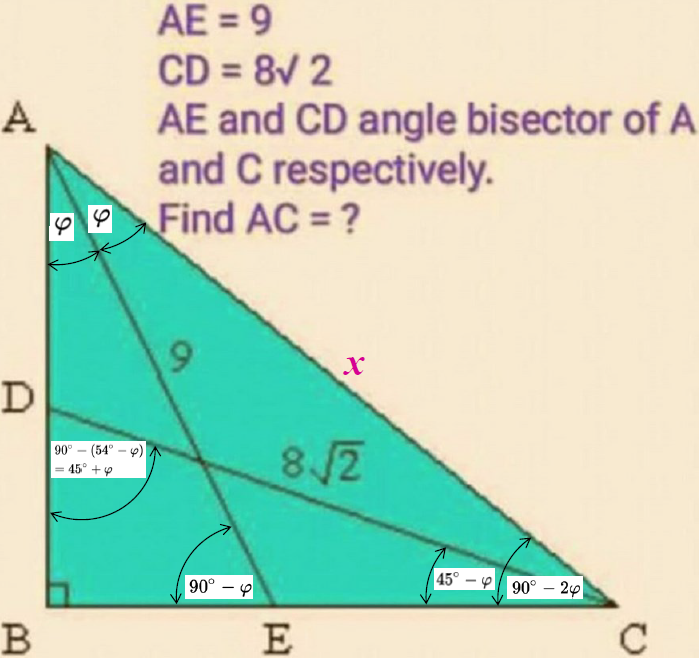 \(\begin{array}{|rcll|} \hline \mathbf{\text{In }\triangle ABE:} \\ \hline \sin(90^\circ-\varphi) &=& \dfrac{c}{9} \\\\ \cos(\varphi) &=& \dfrac{c}{9} \\\\ \mathbf{c} &=&\mathbf{ 9\cos(\varphi)} \qquad (1) \\ \hline \end{array} \begin{array}{|rcll|} \hline \mathbf{\text{In }\triangle ABC:} \\ \hline \sin(90^\circ-2\varphi) &=& \dfrac{c}{x} \\\\ \cos(2\varphi) &=& \dfrac{c}{x} \\\\ \mathbf{c} &=&\mathbf{ x\cos(2\varphi)} \qquad (2) \\ \hline \end{array} \\ \begin{array}{|lrcll|} \hline (1)=(2): & c = \mathbf{ 9\cos(\varphi)} &=& \mathbf{ x\cos(2\varphi)} \\\\ & 9\cos(\varphi) &=& x\cos(2\varphi) \\\\ & \mathbf{x} &=& \mathbf{\dfrac{9\cos(\varphi) } {\cos(2\varphi)}} \\\\ & x &=& \dfrac{9\cos(\varphi) } {\cos^2(\varphi)-\sin^2(\varphi)} \\\\ & x\Big(\cos^2(\varphi)-\sin^2(\varphi)\Big) &=& 9\cos(\varphi) \quad | \quad : \cos^2(\varphi) \\\\ & x\Big(1-\tan^2(\varphi)\Big) &=& \dfrac{9}{\cos(\varphi)} \quad | \quad \dfrac{1}{\cos(\varphi)} = \sqrt{1+\tan^2(\varphi) } \\\\ & x\Big(1-\tan^2(\varphi)\Big) &=& 9\sqrt{1+\tan^2(\varphi) } \\\\ & \mathbf{x} &=& \mathbf{\dfrac{9\sqrt{1+\tan^2(\varphi) }} {1-\tan^2(\varphi)}} \qquad (3) \\ \hline \end{array}\)