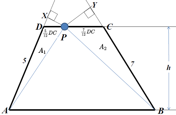 \(\begin{array}{|rcll|} \hline 2A_1 &=& AD*PX \\\\ 2A_2 &=& BC*PY \\\\ \hline \dfrac{2A_1}{2A_2} &=& \dfrac{ AD*PX } {BC*PY} \quad | \quad AD=5,\ DC=7 \\\\ \dfrac{A_1}{A_2} &=& \dfrac{ 5*PX } {7*PY} \quad | \quad \mathbf{ \dfrac{A_1}{A_2} = \dfrac{5}{7} } \\\\ \dfrac{5}{7} &=& \dfrac{ 5*PX } {7*PY} \\\\ \dfrac{5}{7}*\dfrac{7}{5} &=& \dfrac{PX}{PY} \\\\ 1 &=& \dfrac{PX}{PY} \quad | \quad * PY \\\\ \mathbf{PY} &=& \mathbf{PX} \\ \hline \end{array}\)