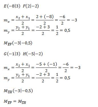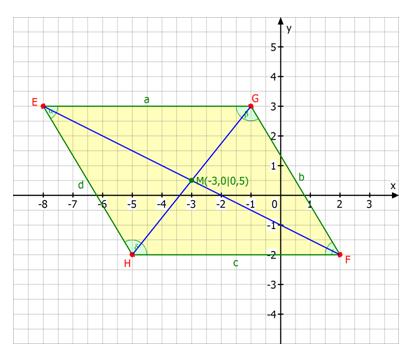 A parallelogram has vertices E(−8, 3), F(2, −2), G(−1, 3), and H(−5, −2). What are the coordinates of the midpoint of each diagonal?