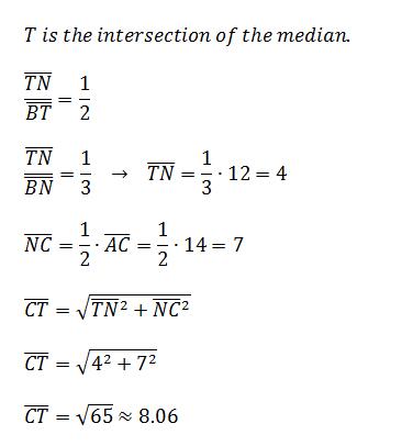1. M is the midpoint of Line AB and N is the midpoint of line AC, and T is the intersection of line BN and line CM, as shown. If, line BN is perpendicular to line AC, BN=12 and AC=14, then find CT.