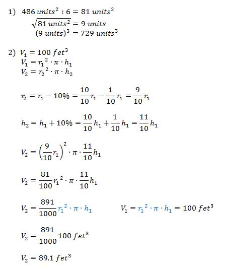 2) The volume of a circular cylinder is 100 cubic feet. If the radius of its base decreases by 10% but the height increases by 10%, what is the volume of the new cylinder in cubic feet?
