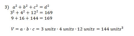 3) The space diagonal of a rectangular prism with integer unit dimensions is 13 units. What is the volume of the rectangular prism in cubic units?