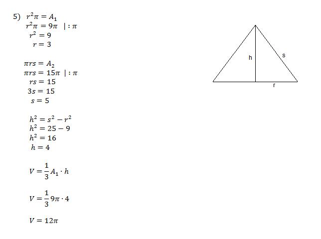 5) The base of a right circular cone has area 9pi square yards. The lateral surface of the cone has area 15pi square yards. What is the volume of the cone in cubic yards?
