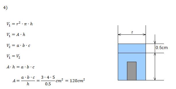 4) A 3cm*4cm*5cm rectangular metal block was put into a well that took the shape of a right circular cylinder. When the block was submerged, the water level in the container had increased by 0.5 centimeters. What is the base area of the well in square centimeters?