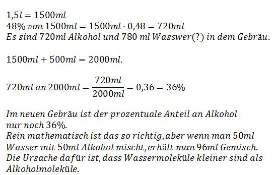 1,5l Gebräu haben 48% Alkohol. Wieviel Alkohol sind es noch, wenn man 0,5l Wasser dazugiesst?