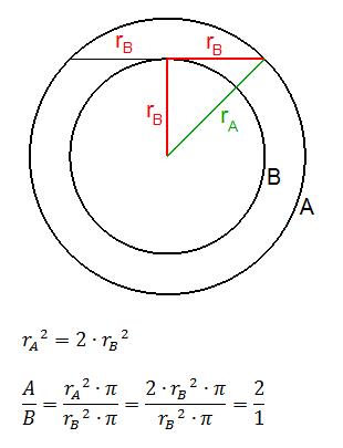 Circle A and circle B are concentric. A chord of circle A that is tangent to circle B has a length that is twice the radius of circle B. What is the ratio of the area of circle A to the area circle B?