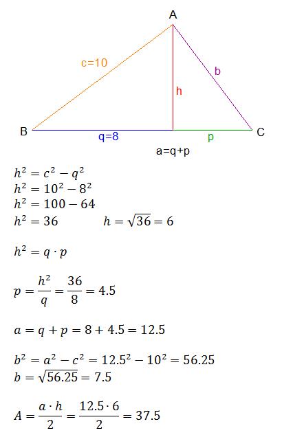 △ABC is a right triangle and line segment AD is an altitude. If AB = 10 and BD = 8 then what is the area of \△ABC?