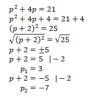 2. Solve the equation p2 + 4p = 21 by completing the square. Show your work. SHOW how you complete the square, show steps.