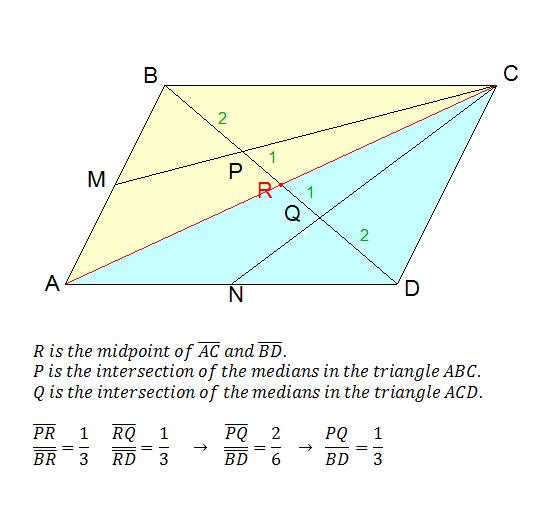 Quadrilateral ABCD is a parallelogram. The midpoints of AB and AD are M and N, respectively. Let P be the intersection of DB and CM and let Q be the intersection of DB and CN. Compute PQ/DB.