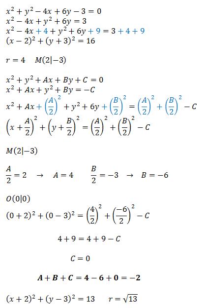 The circle x^2 + y^2 + Ax + By + C = 0 passes through the origin, and has the same center as the circle x^2 + y^2 - 4x + 6y - 3 = 0. What is A + B + C?