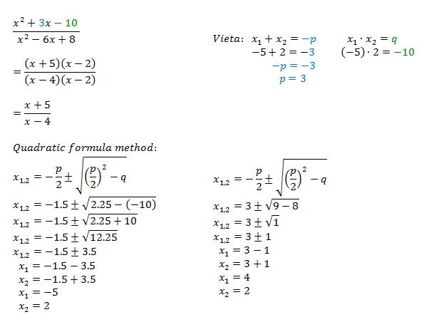 1. Simplify the expression (x^(2)+3x-10) / (x^(2)-6x+8) Show your work.