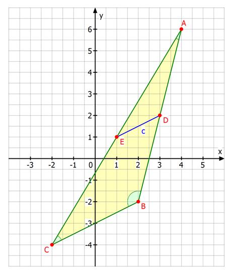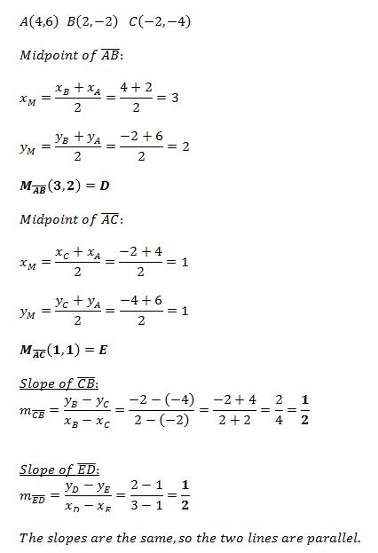 A,B and C are the vertices of a triangle. A has coordinates (4,6). B has coordinates (2,-2). C has coordinates (-2,-4). D is the midpoint of B. E is the midpoint of AC. prove that de is parallel to BC.