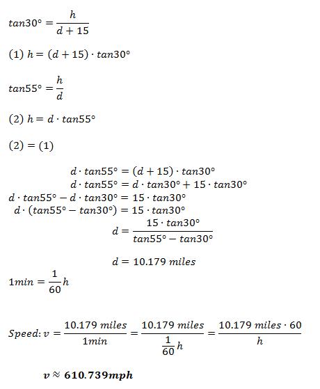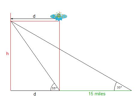 Sam sees a UFO hovering in the sky. He measures the angle of elevation of the UFO at 30 . He calls Julie, who is 15 miles closer to the UFO and asks her what her angle of elevation to the UFO is. She measures it to be 55 . The alien in the UFO sees the two kids and flies to a point directly over Julie's head (same altitude). This flight takes exactly one minute. How fast did the UFO move in miles per hour.