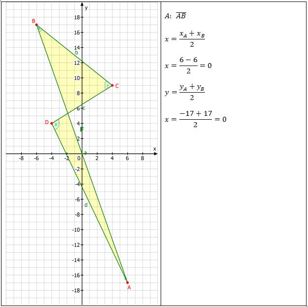 Given A(6, -17), B(-6, 17), C(4, 9), D(-4, 4), the midpoint of which segment is at the origin?