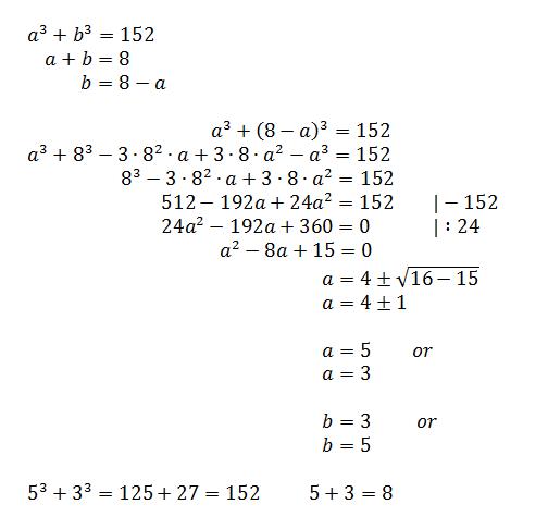Use the identity a^3+b^3=(a+b)^3 - 3ab(a+b) to determine the product of the two numbers if the sum of the cubes of the two numbers is 152 and the sum of the two numbers is 8.