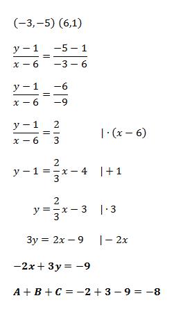 A line passes through the points (-3,-5) and (6,1). This line is the graph of the equation Ax + By = C, where A, B, and C are integers with greatest common divisor 1, and A is positive. Find A + B+ C.