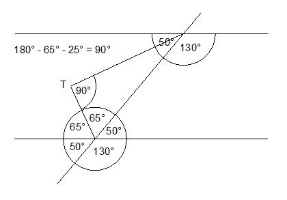 In the figure below, the horizontal lines are parallel and the bisectors of the two interior angles intersect at T.