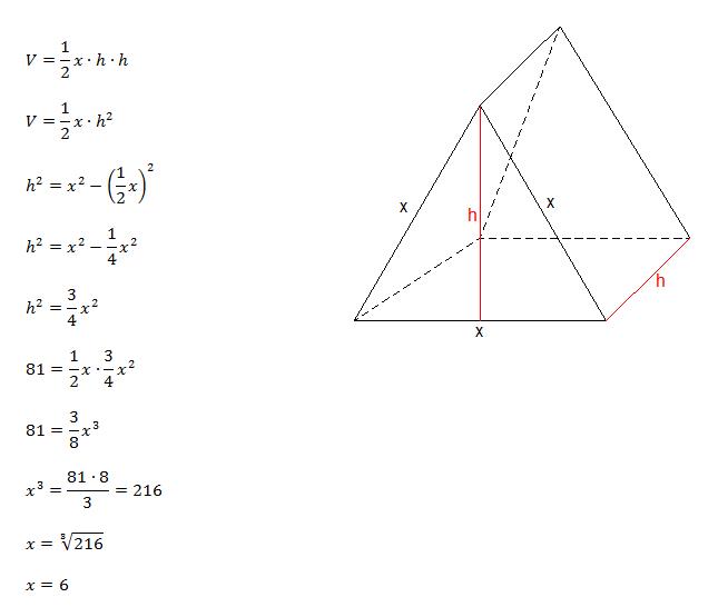 A right prism has a base that is an equilateral triangle. The height of the prism is equal to the height of the base. If the volume of the prism is 81, what are the lengths of the sides of the base?