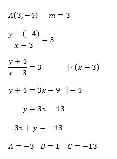 A line passes through point (3, -4) and has a slope of 3. Write an equation in Ax+By=C form for this line. Use integers for A, B, and C.