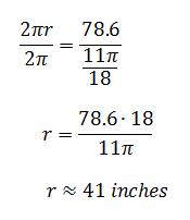The arc length of an arc subtended by an angle measuring 11π/18 radians is 78.6 inches. What is the radius of the arc?