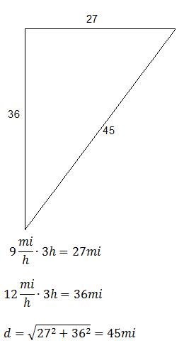 How many miles are in the shortest distance between them at the end of 3 hours?
