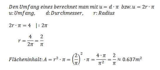 Welchen Flächeninhalt hat eine kreisrunde Tischplatte, um die man ein 4m langes Seil legen kann?