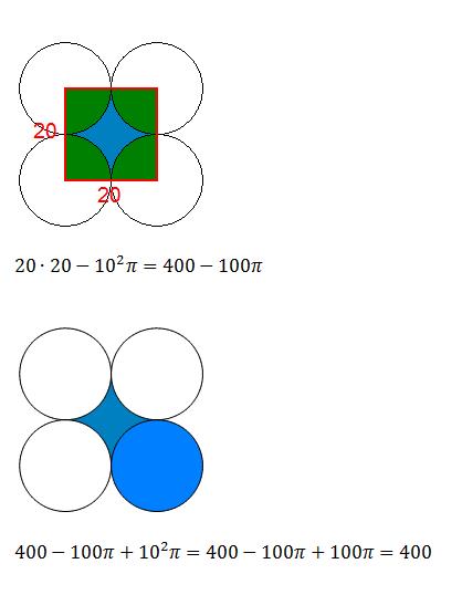 Given that all the circles have equal radius of 10 cm, what is the area of the shaded blue part?