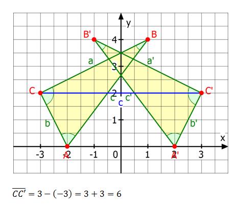 Triangle ABC with vertices A(−2, 0), B(1, 4) and C(−3, 2) is reflected over the y-axis to form triangle A'B'C'. What is the length of a segment drawn from C to C'?