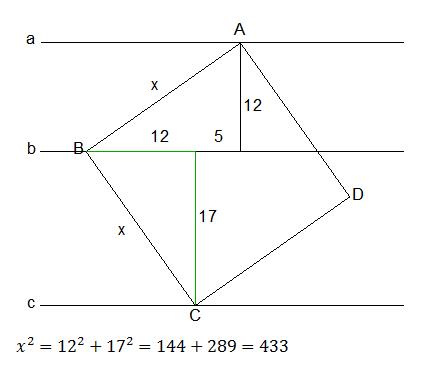 Quadrilateral ABCD is a square. Let a,b,c be parallel lines passing through A, B , and C, respectively. The distance between lines a and b is 12, and the distance between lines b and c is 17. Find the area of square ABCD.