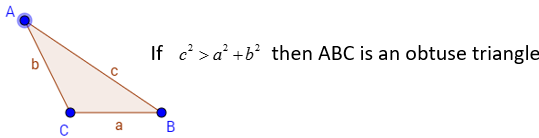 | \(c^2>a^2+b^2\) | "s" will be the longest side, so plug it into "c." Plug the other two side lengths in any order. | ||