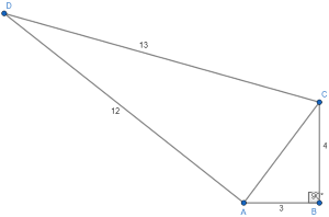 Yet again, \(\triangle DAC\) is in a similar situation. It is a 5-12-13 triangle, which is another Pythagorean triple. Because of this, \(m\angle DAC=90^\circ\).