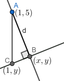 | \(d=\sqrt{(x_2-x_1)^2+(y_2-y_1)^2}\) | The two coordinates we are plugging in is \(\left(\frac{83}{29},\frac{10}{29}\right)\) and (1,5) |
