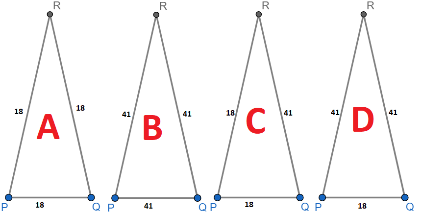 A few rules govern the existence of this triangle. Let's consider the rules one at a time. If the sidelengths of \(\triangle PQR\) can only consist of lengths of 18 or 41, then this narrows the possibilities to 4 options. The images below are not drawn to scale. The central label indicates how I will differentiate and refer to the triangles: